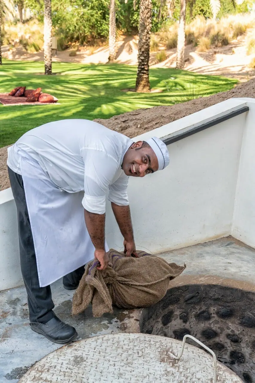 Ziyad Mohamed Ramadhan Al Balushi——酒店的副厨告诉他们,他正在精心而费时地烹饪他的招牌菜,这是阿曼最喜欢的菜肴。 完成前期调味工作后,厨师Ziyad将装有羔羊肉的袋子搬到草坪的一个角落,那里是一个定制坑,深约六英尺,在地面上有一个坑盖,周围被涂成混凝土围墙。