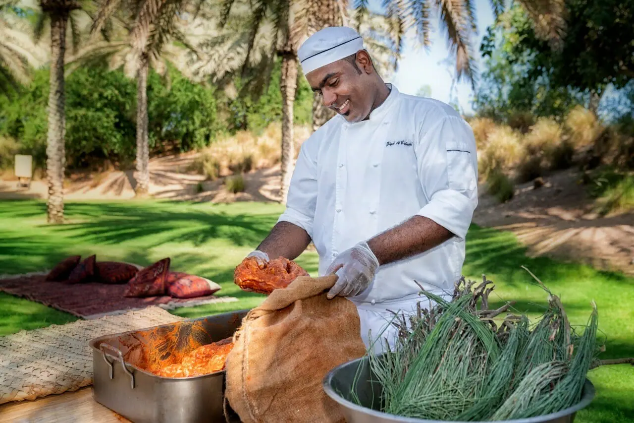 众人的目光从阿曼马斯喀特澈笛度假酒店的Serai泳池望过去,看着度假村的一位厨师站在棕榈树荫的一张桌子前,将橙黄色的香料酱抹在厚切的羔羊肉上。 然后,厨师将肉和切成薄片的香蕉叶一起装进一个粗麻布袋中,然后用不锈钢丝将其缠绕起来。