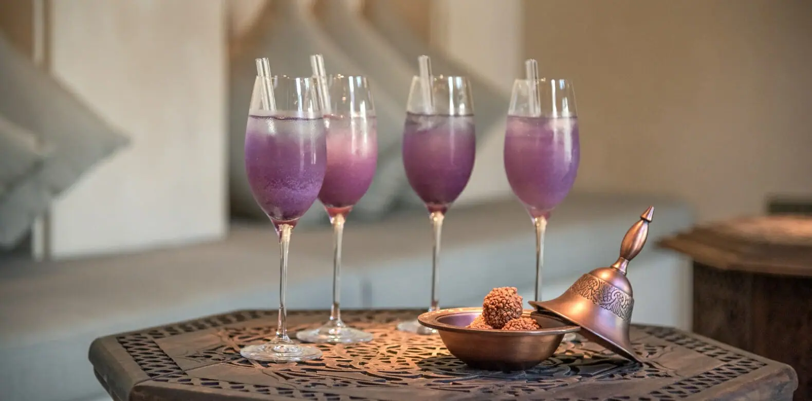 赏心悦目的饮品,简直令人舍不得啜饮。与其饮用,不忍心,不如欣赏。这款薰衣草混合物结合了葡萄柚汁、柠檬汁、薰衣草糖浆、覆盆子糖浆、蓝色库拉索糖浆、珍珠粉和苏打水。这些清爽又妙趣横生的薰衣草调配品是用鲜榨葡萄柚、柠檬汁、薰衣草浆、木莓浆、蓝橙浆和苏打水制成的,再加入“神奇”的特殊成分:珍珠粉。“珍珠粉位于饮料的底部。当你搅拌它时,玻璃杯会变成一个旋转的美丽星云,”主厨Ashish说。“太奇妙了。” 另一款特色饮品叫做蓝色树莓,混合了新鲜的蓝莓、柠檬汁、浆果泥、蜂蜜糖浆、迷迭香、苏打水和金粉 – 是的,24克拉认证的可食用金粉。迷迭香小枝像小扫帚一样被捆绑在一起,上面喷上金粉,当你搅拌饮料时,伴着浓郁的植物和真金,冲泡出一款绝佳的饮品。
